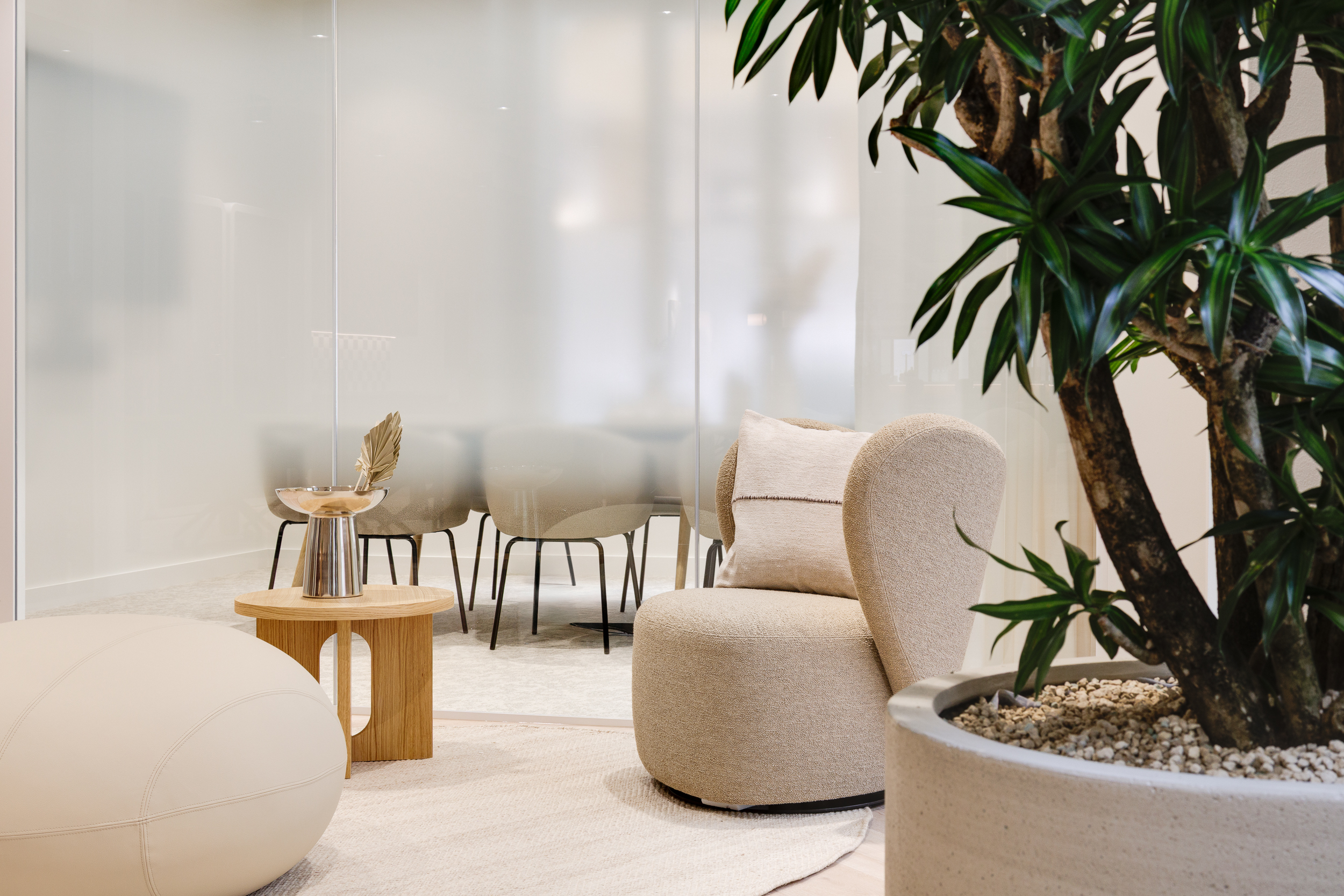 - A warm palette of oak, boucle and khaki tones complemented by sustainable choices such as chairs in recycled polypropylene and the tables made from coffee shell waste and recycled plastics.