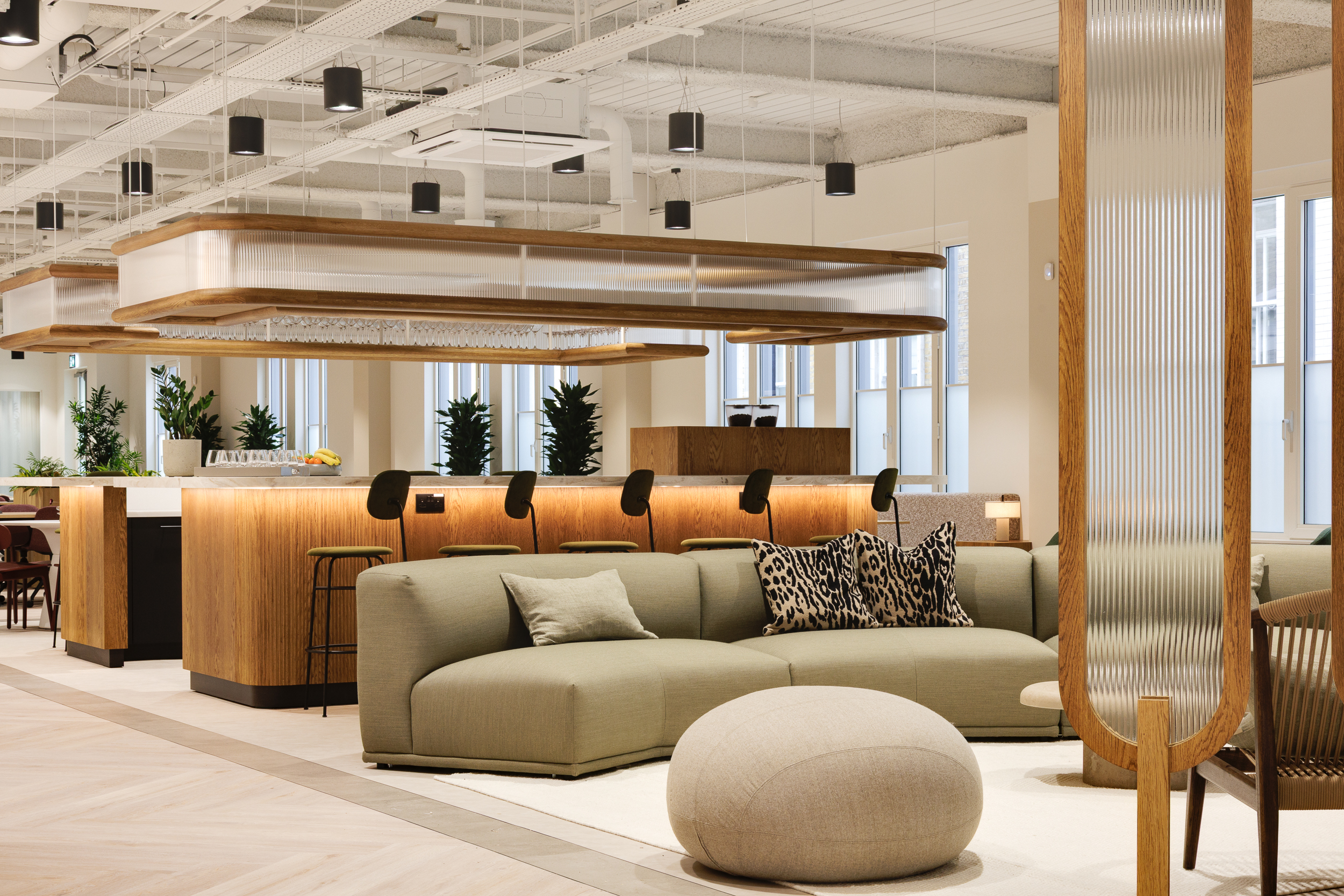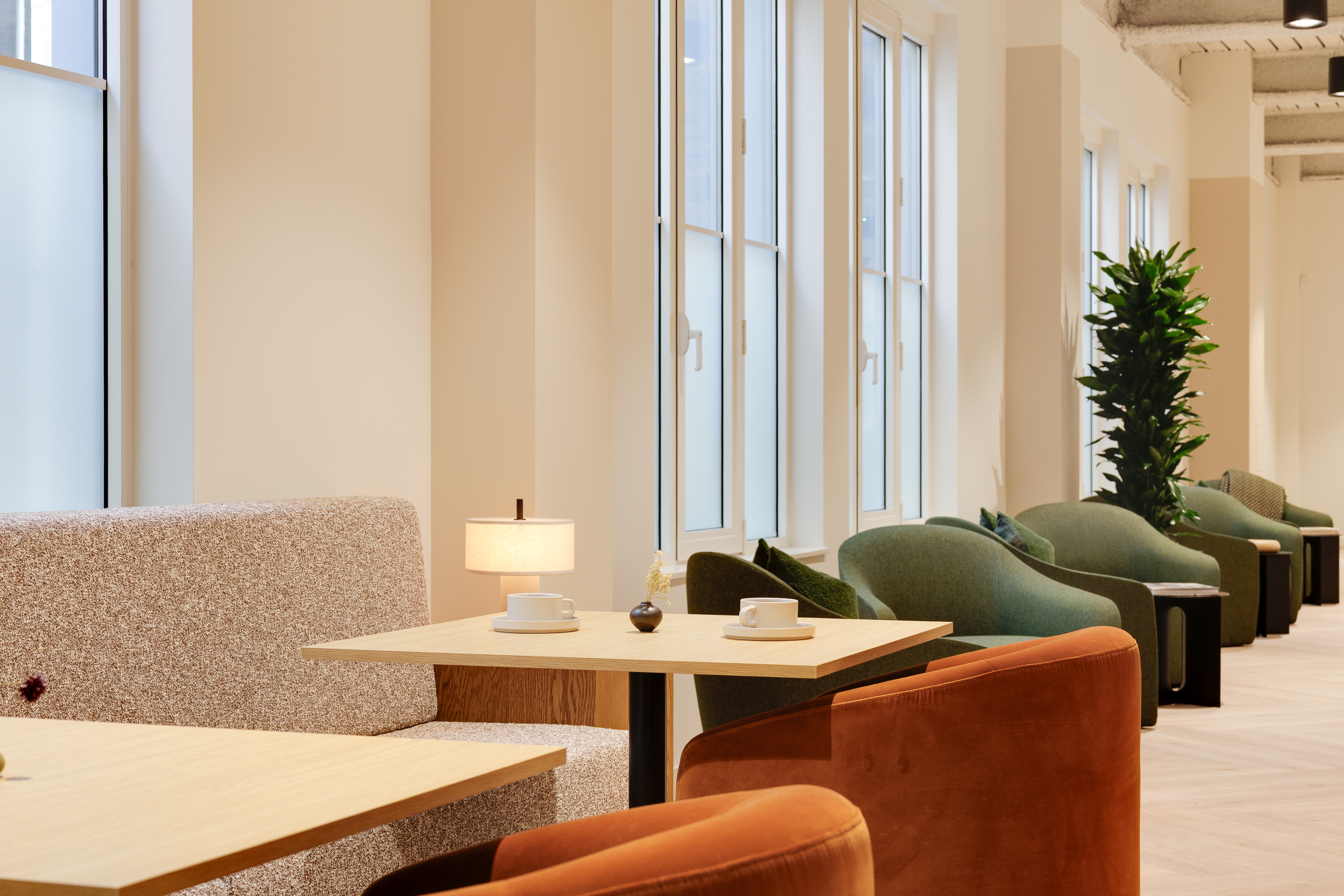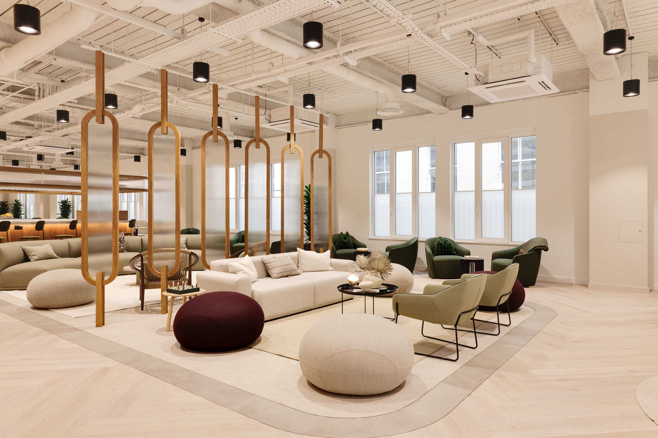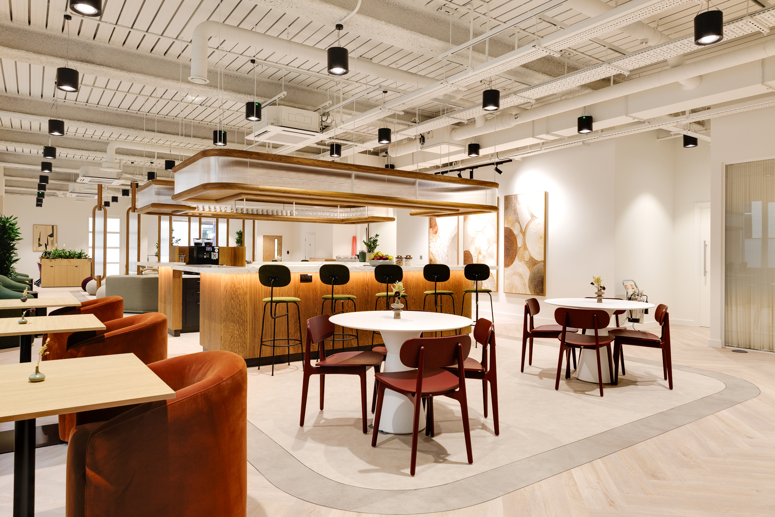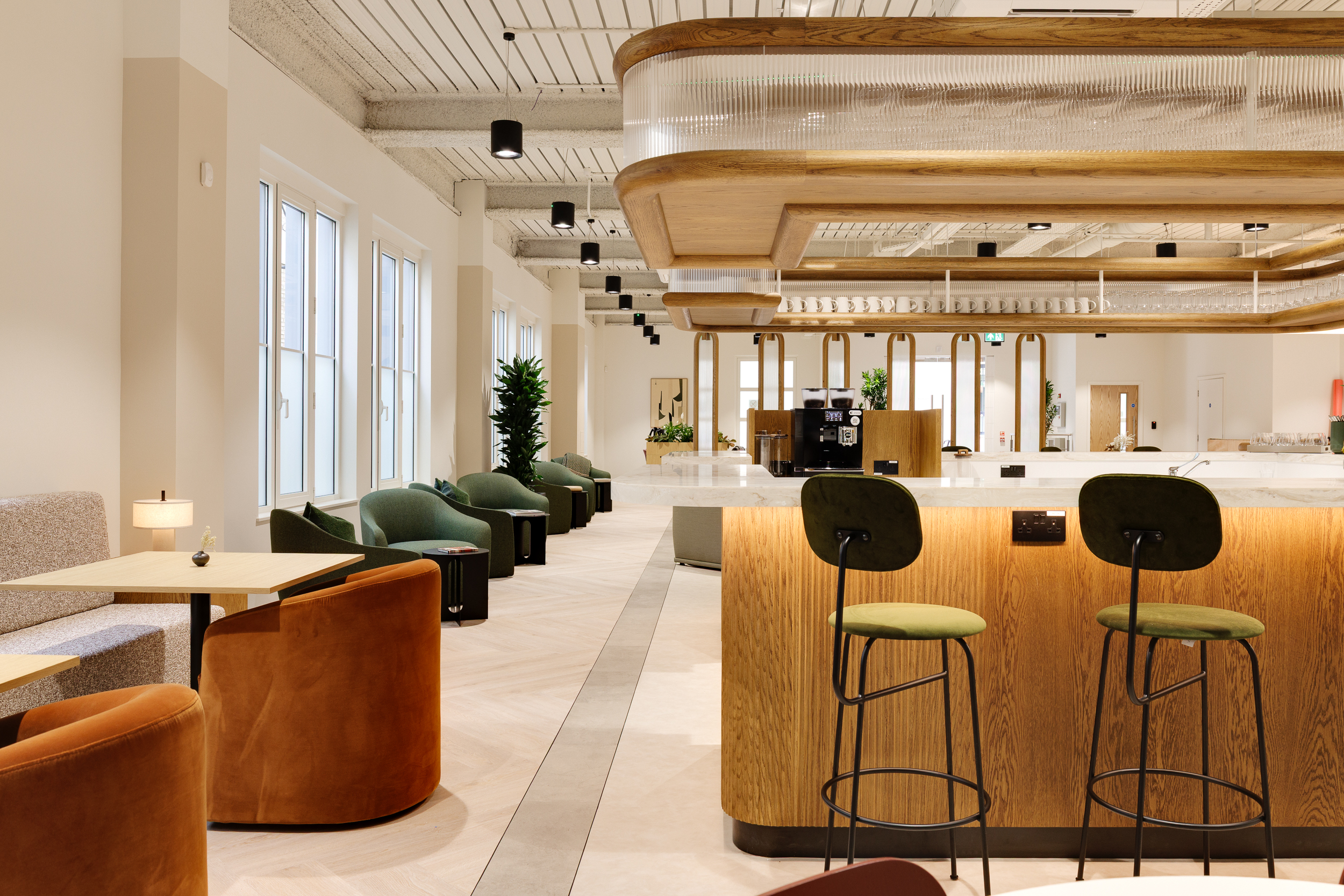 The ground floor was conceived as a space where first impressions linger, more club than corporate. We specified Muuto Connect modular sofas in muted khaki upholstery, paired with NORR11 Little Big Chairs and Softline Cut pouffes that soften the lounge areas. Audo oak Androgyne Side Table, Rugvista Kelim loom rugs, and Mater Alder Lounge Table made from coffee shell waste and recycled polypropylene introduced tactility, while Modus PLC chairs in a rich red wine finish and Audo Co Lounge Chair upholstered in a light neutral colour gave the barista bar its own identity.