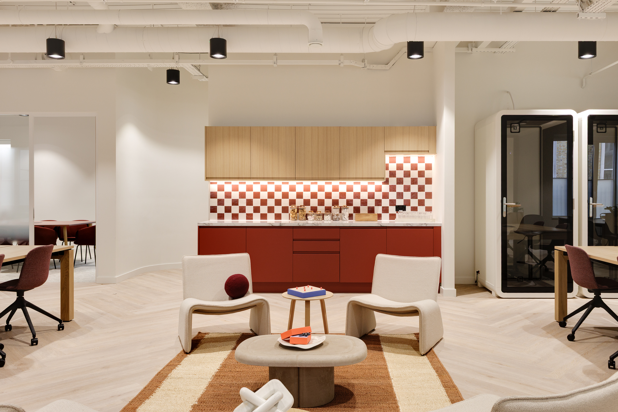 Lounges carried through the same hospitality influence, with Hay Mags Low Armrest Corner Combination upholstered in a mix of deep burgundy-brown and monochrome boucle, Audo Co Lounge Chair and textured rugs from Muuto Ply Rug and Benuta Pop Cotton Rug Lenny in Terracotta, both made from recyclable fibres. Communal areas such as teapoints were paired with Lapalma Lem bar stools in oak and Ondarreta Hari Polypropylene chairs in clay and silk tones, combining durability with an understated finish.